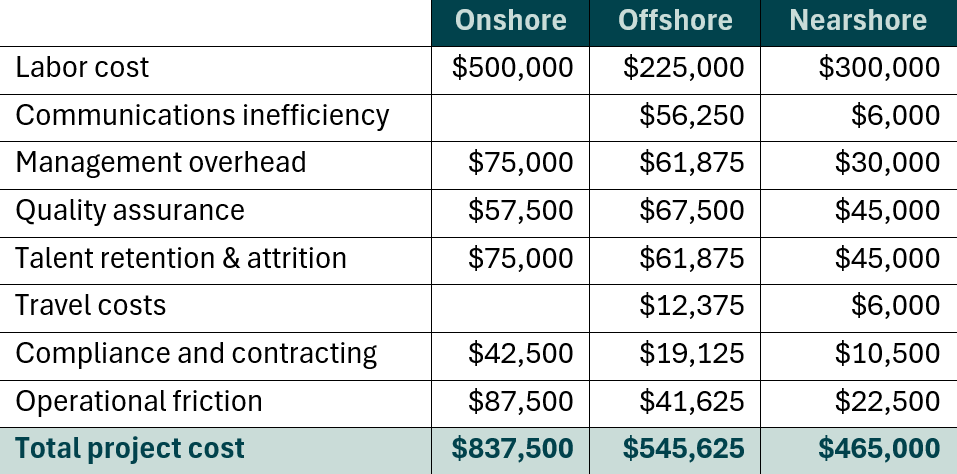 Let’s take what we’ve just modeled and create an example. Let’s assume you’ve got a project with a base cost of $500,000 if you were to complete it with onshore labor. Using the median costs in each category, your project costs are as follows:
